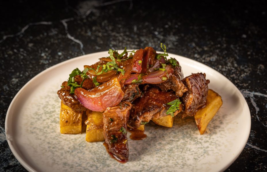 Solomillo de ternera nacional, salteado con Cebolla morada, ají y cilantro sobre una cama de Lingotes de patata frita, con salsa zekkei.